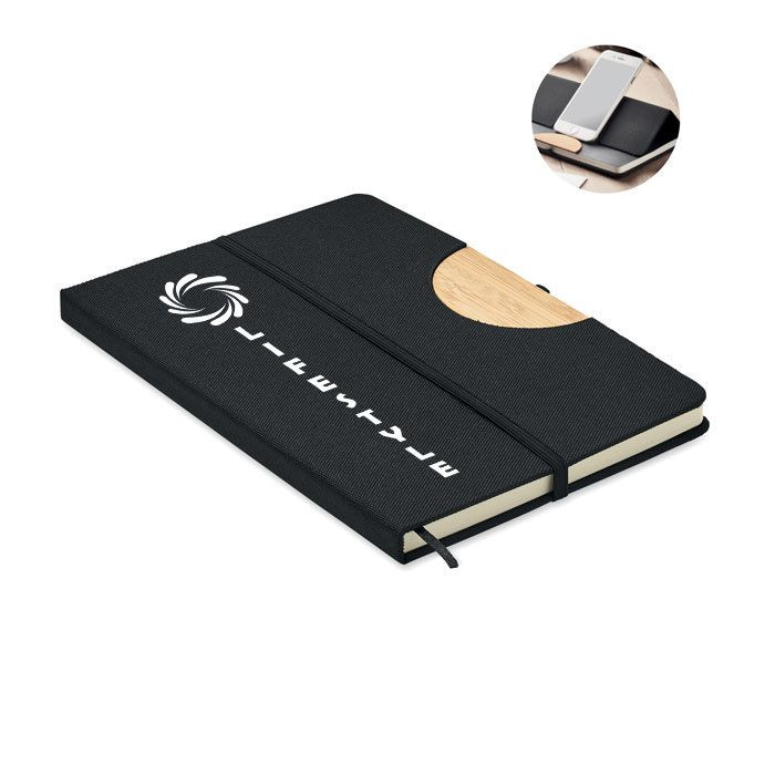 Poznámkový blok A5 s pevnými deskami a funkcí stojánku na chytrý telefon.